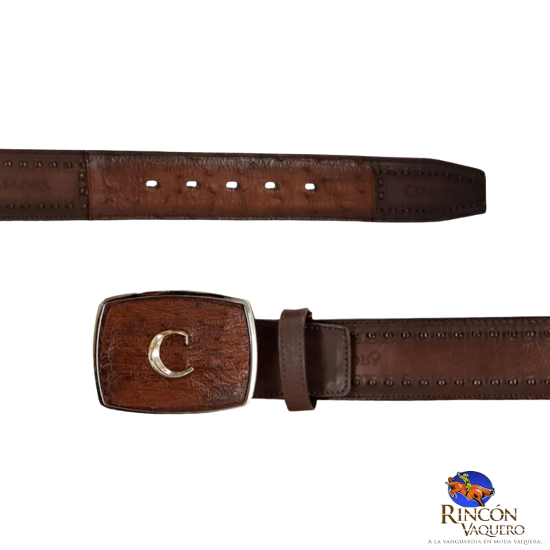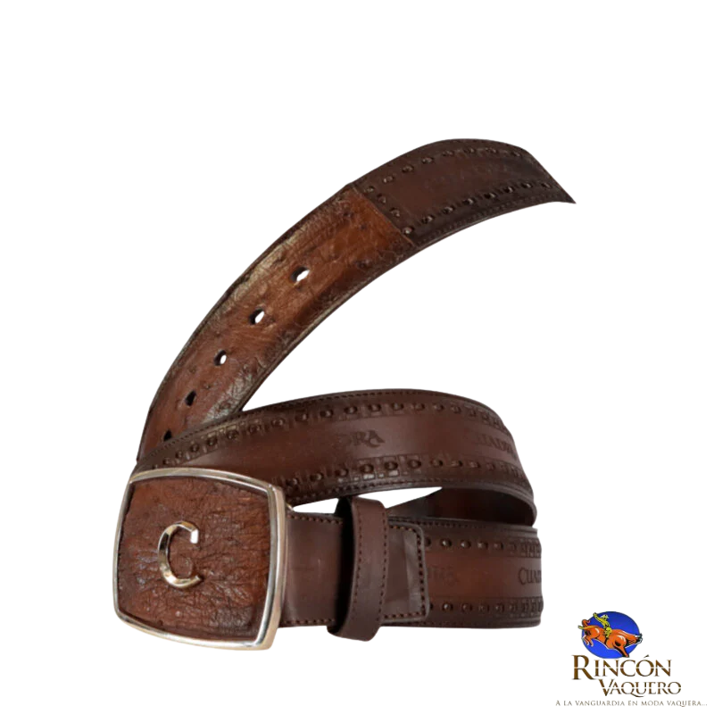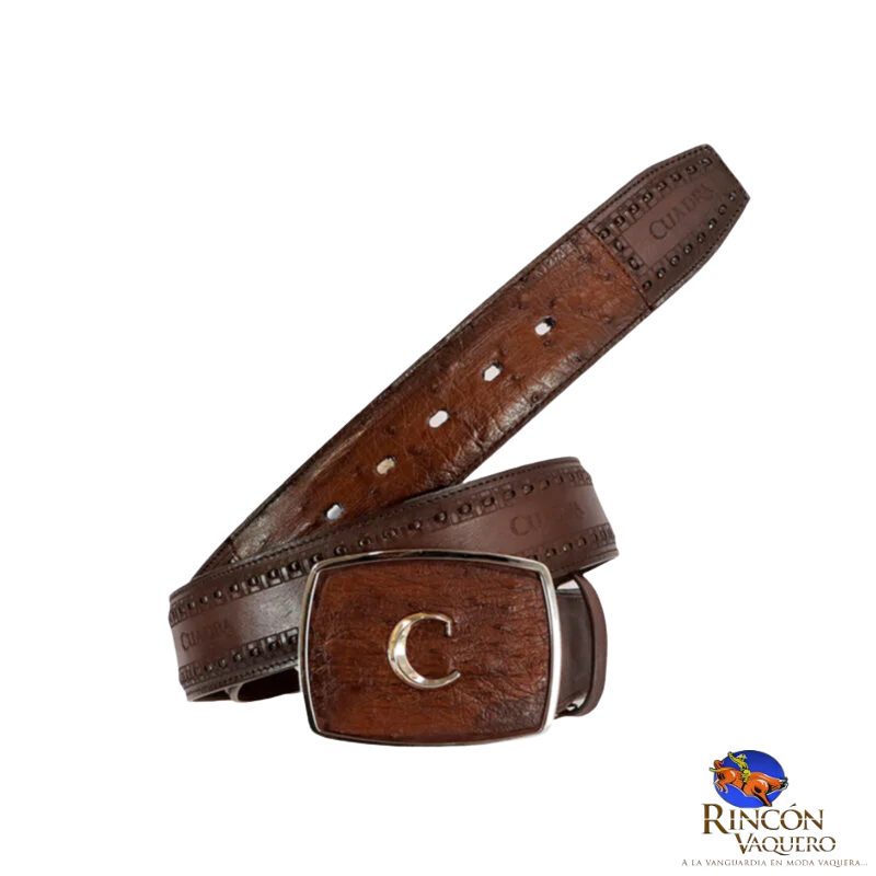 Cinturón vaquero para caballero en piel genuina de avestruz y bovino. Con aplicación metálica del monograma Cuadra en hebilla