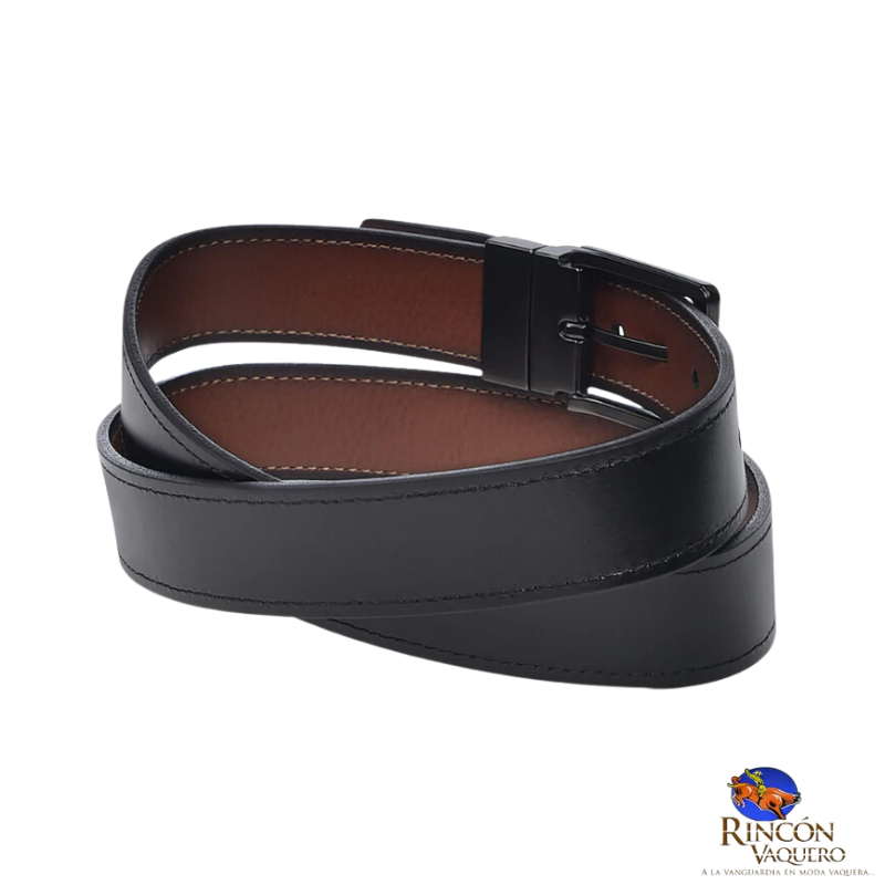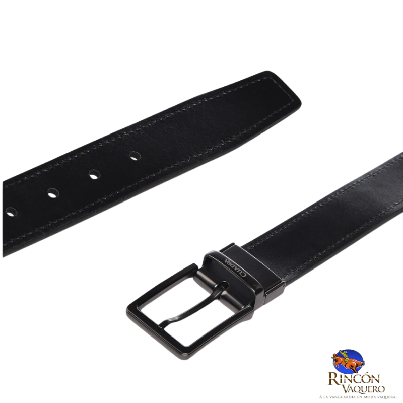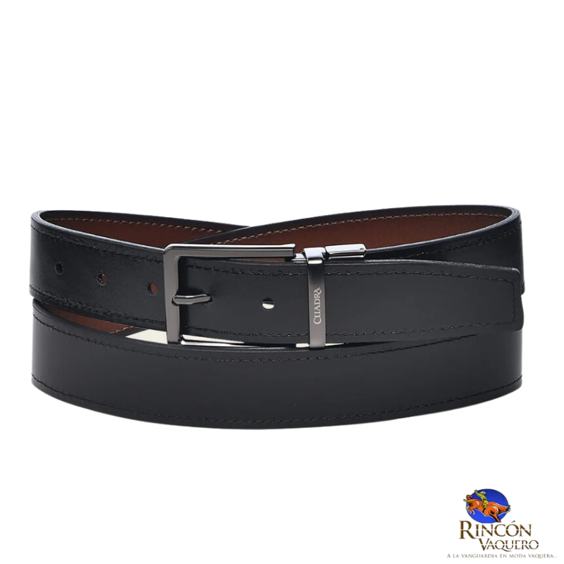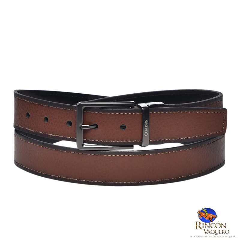 Cinturón para caballero en piel de bovino CS441RS. Presenta detalles de corte láser en motivos geométricos y líneas pintadas a mano. Sutil grabado de logotipo Cuadra. Con hebilla metálica reversible. Color negro | café.