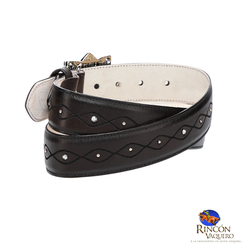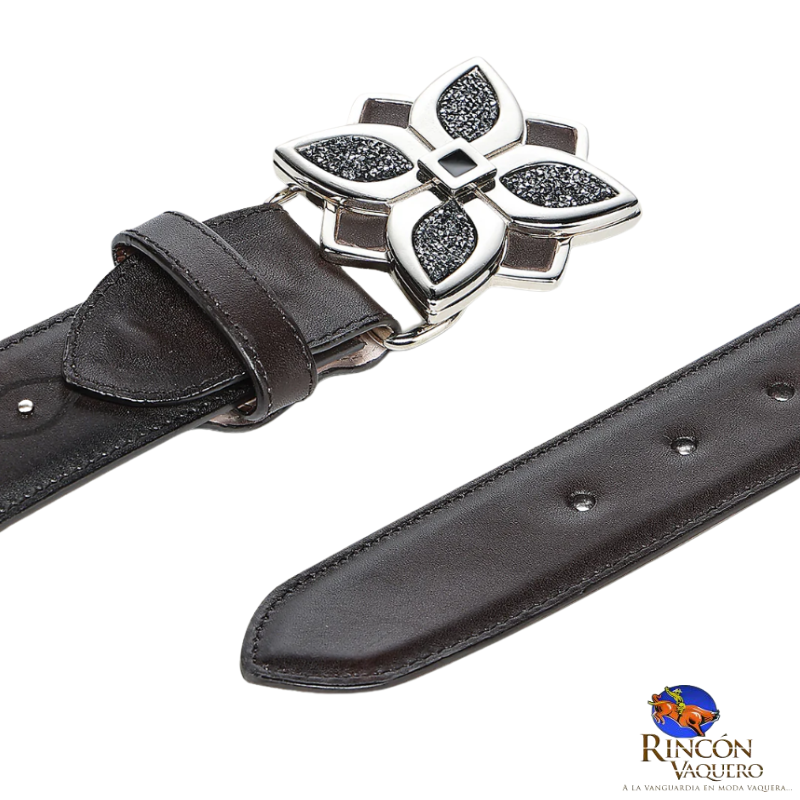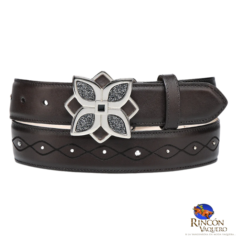 Cinturón casual para dama en piel genuina de bovino. Presenta grabado láser, aplicación de estoperoles y cristales auténticos de Swarovski. Hebilla metálica de 38 mm en forma de flor con aplicación de estoperoles. Con forro en piel de bovino.