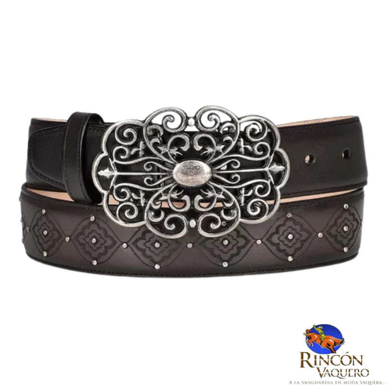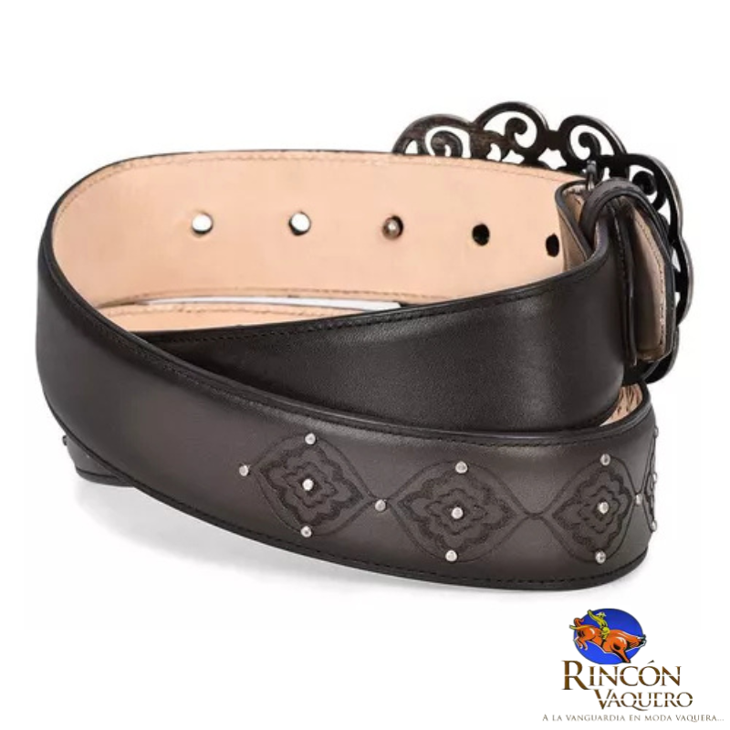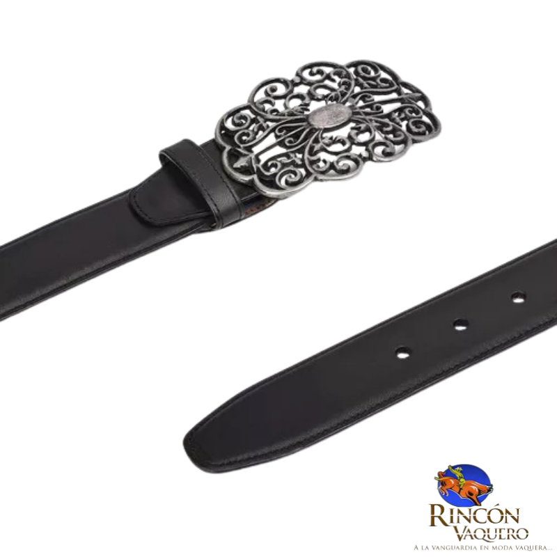 Cinturón estilo western para mujer en piel bovina. Presenta grabado láser con adornos orgánicos y aplicaciones de metal vintage. Con hebilla de metal vintage y forro de piel bovina grabada con el logotipo de Cuadra mediante serigrafía.