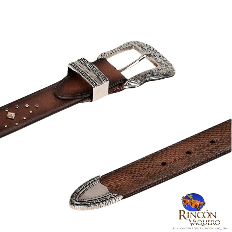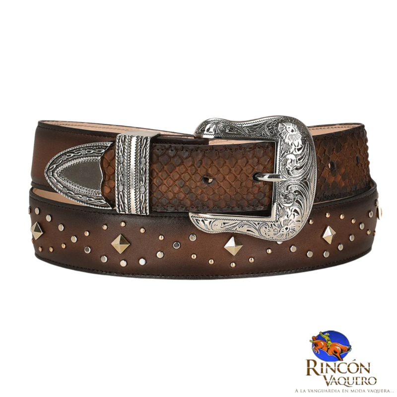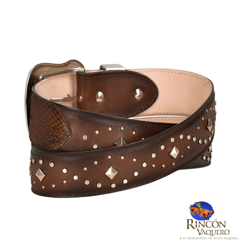 Cinturón vaquero para dama en piel genuina de pitón y piel de bovino. Presenta estoperoles a lo largo de tira y aplicación en piel genuina de pitón en la punta. Con hebilla de 38 mm y punta metálica western. Con forro en piel de bovino con serigrafía de logotipo Cuadra. Color café. El producto puede diferir de la foto debido a variaciones naturales en la piel. Las marcas y cicatrices que puede presentar lejos de ser considerados como defecto demuestran autenticidad de cada producto.