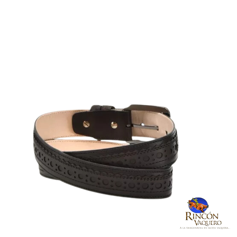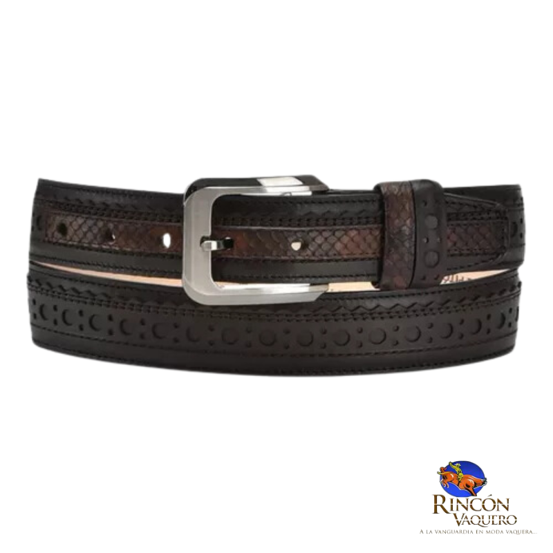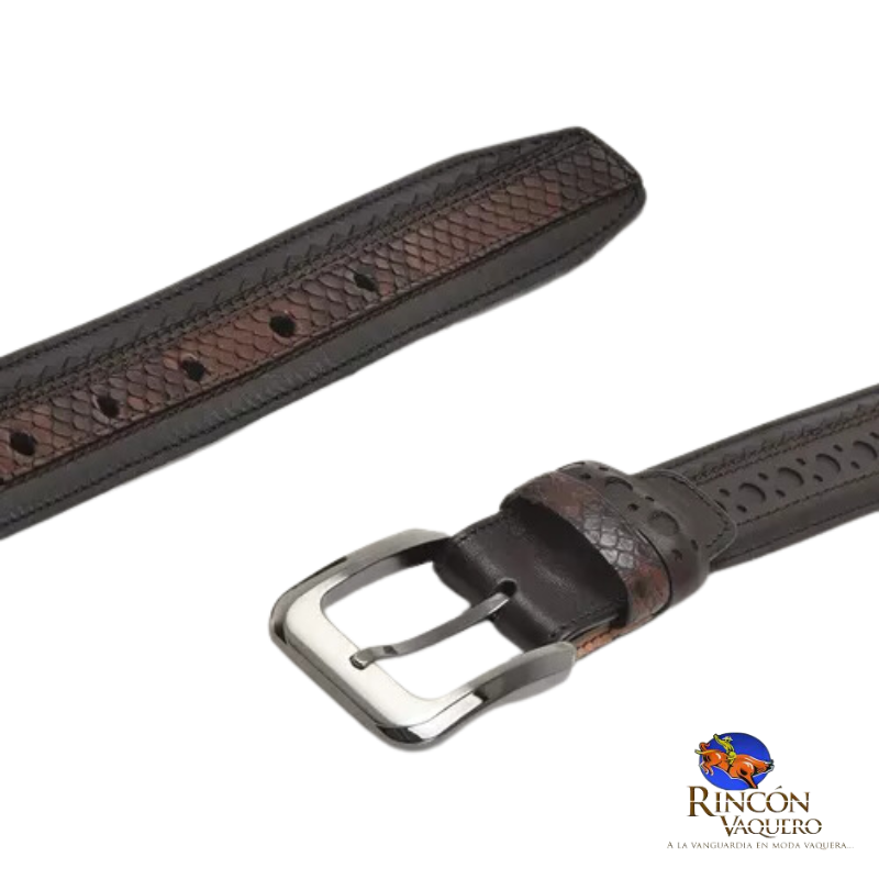 Cinturón de vestir para caballero con piel genuina de pitón en la punta. Con perforados grandes y pequeños a lo largo del cinto además de finos pespuntes. Presenta una hebilla metálica de 35mm. Forro en piel genuina de bovino personalizado con la marca. Color chocolate.