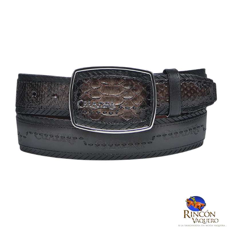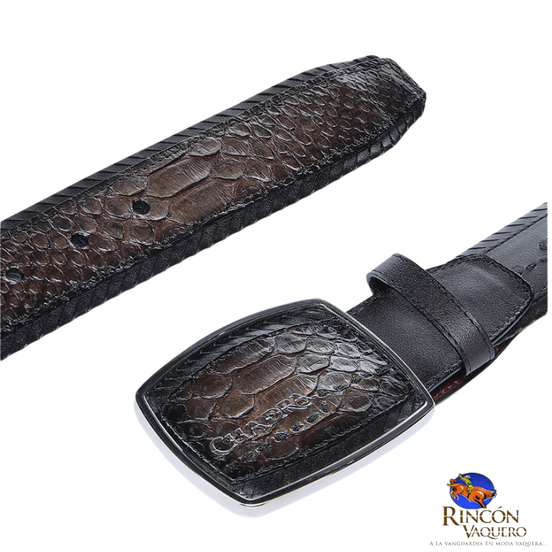 Cinturón vaquero para caballero en piel genuina de pitón y piel genuina de bovino. Presenta grabado láser de logotipo Cuadra, fino bordado de textil a lo largo de la tira. Con hebilla de 45 mm forrada en piel de pitón con aplicación metálica del logotipo de Cuadra y fino bordado de textil. Forro de piel de bovino.