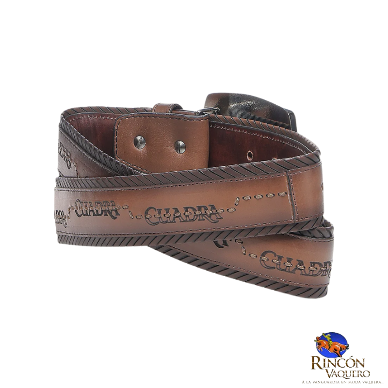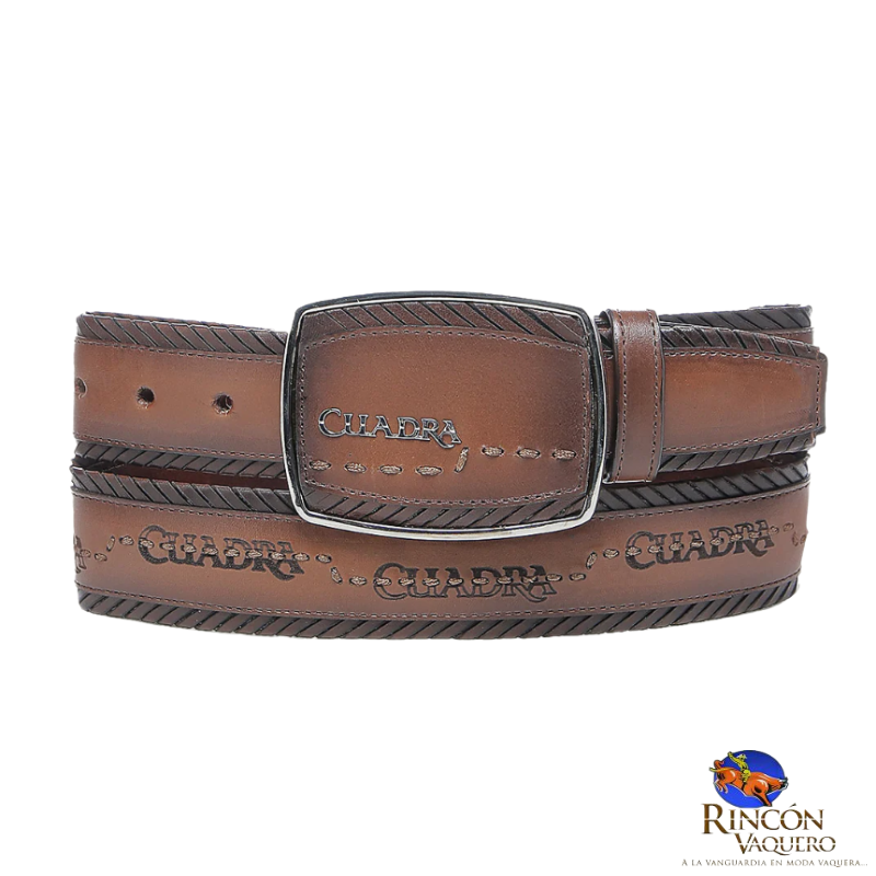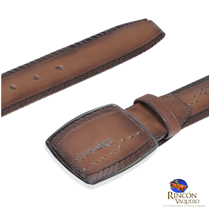 Cinturón vaquero para caballero en piel genuina de bovino. Presenta grabado láser de logotipo Cuadra, fino bordado de textil a lo largo de la tira. Con hebilla de 45 mm forrada en piel de bovino con aplicación metálica del logotipo de Cuadra y fino bordado de textil. Forro de piel de bovino.