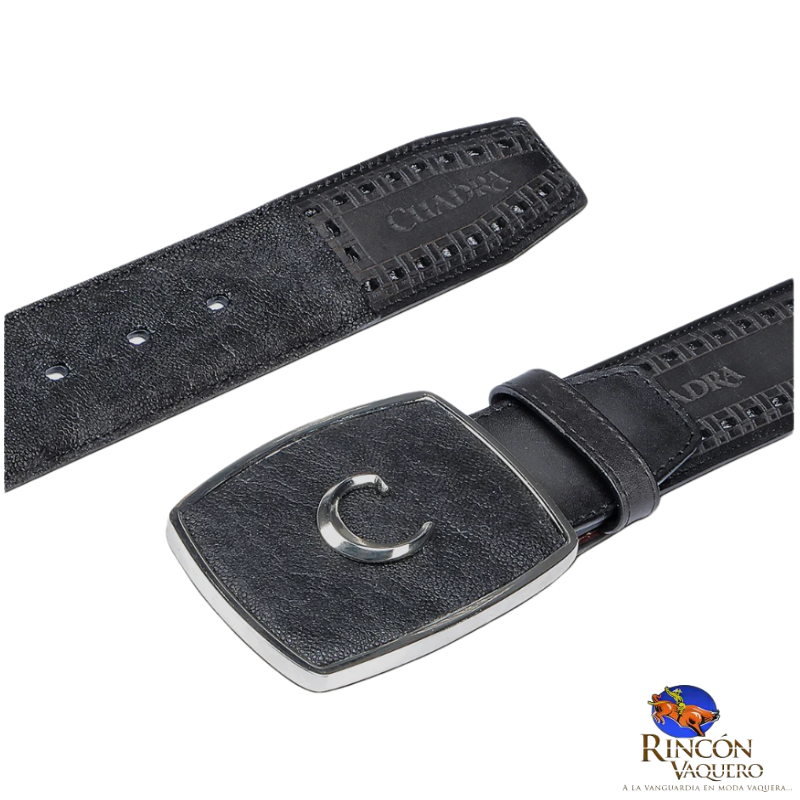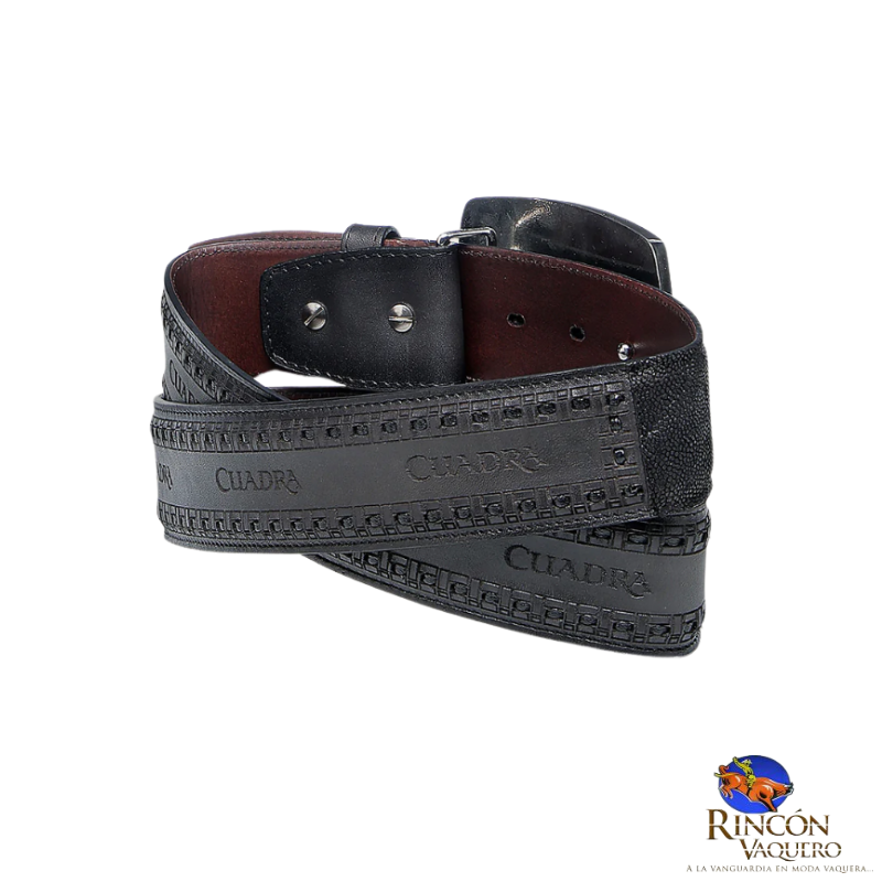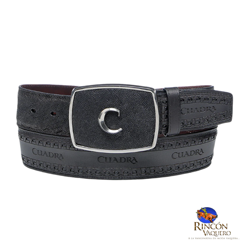 Cinturón tradicional para caballero en piel genuina de elefante y bovino. Con aplicación metálica del monograma Cuadra en hebilla. Color negro.