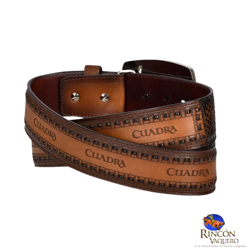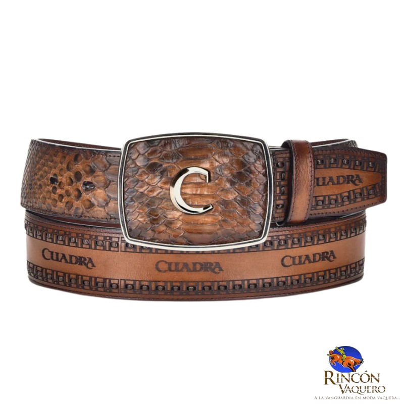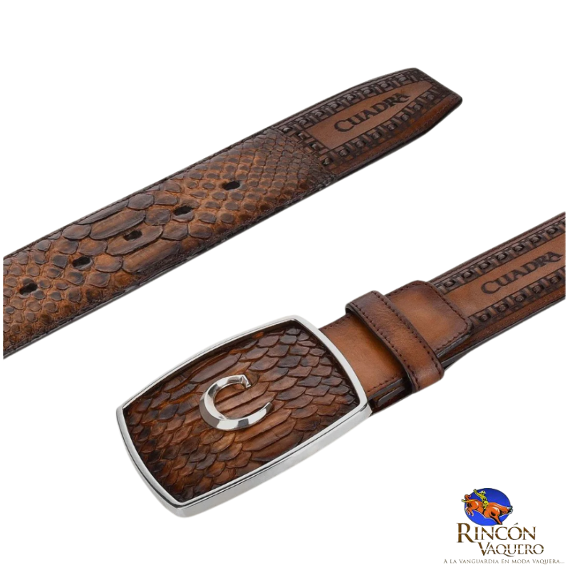 Cinturón tradicional en piel genuina de pitón para caballero. Con grabado láser del logotipo de Cuadra. Hebilla metálica rectangular con el monograma de Cuadra en acabado mate. Detalles de bordado y perforaciones en la piel.