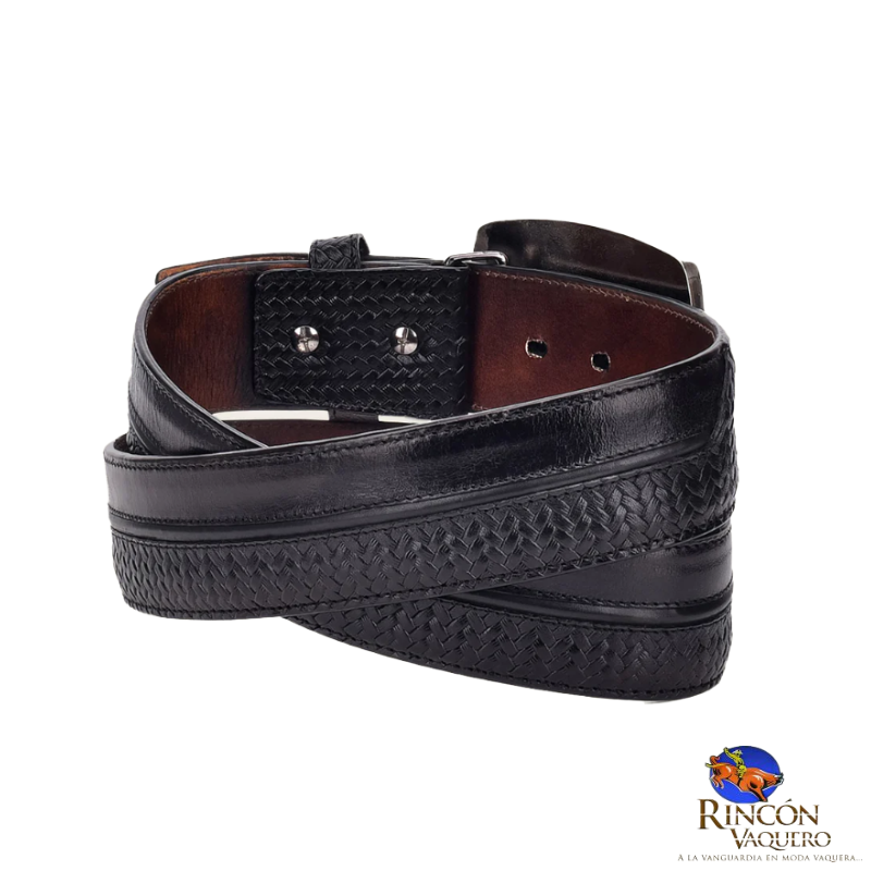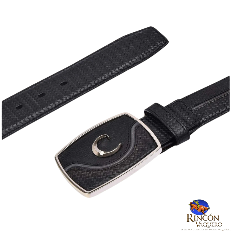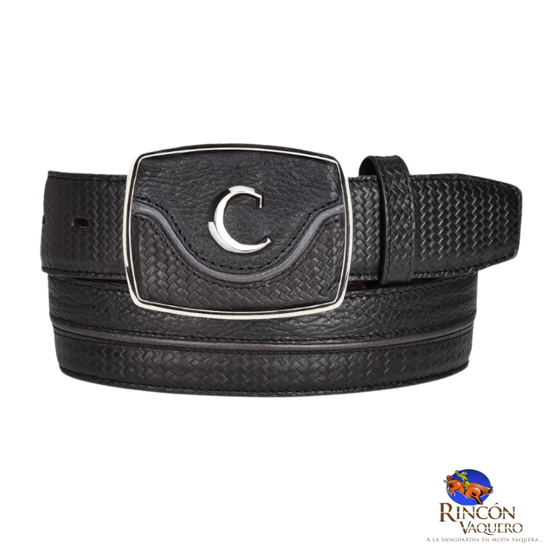 Cinturón para caballero en piel genuina de bovino. La hebilla presenta aplicación metálica del monograma Cuadra al centro. Contraste de texturas en correa. Color negro.