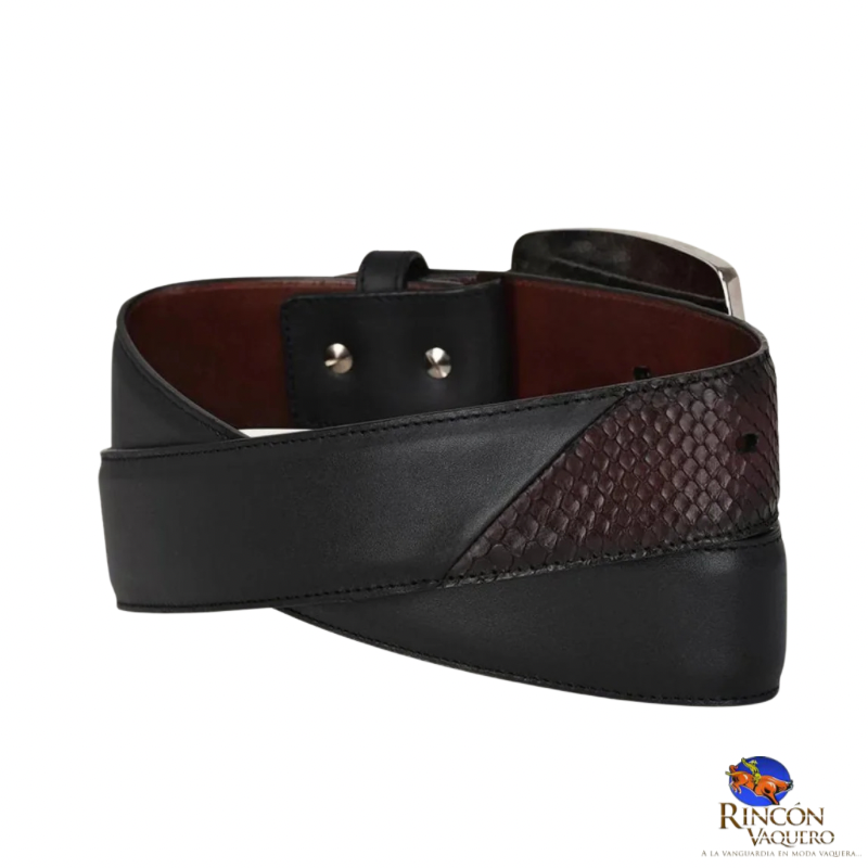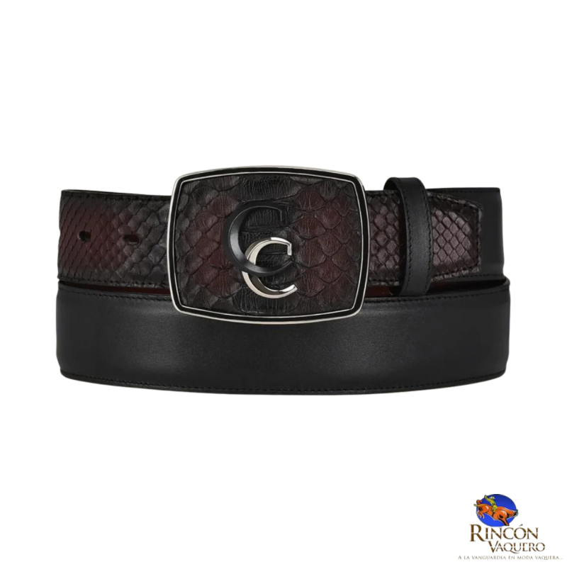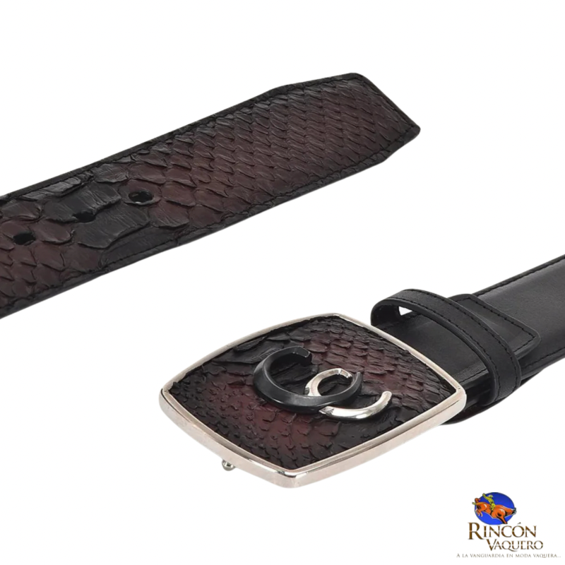Cinturón vaquero para caballero en piel genuina de pitón sobre la hebilla y en la punta de la tira y piel de bovino. Con hebilla de 45 mm forrada en piel de pitón con aplicación metálica de monograma Cuadra. Con forro en piel de bovino con serigrafía de logotipo Cuadra.