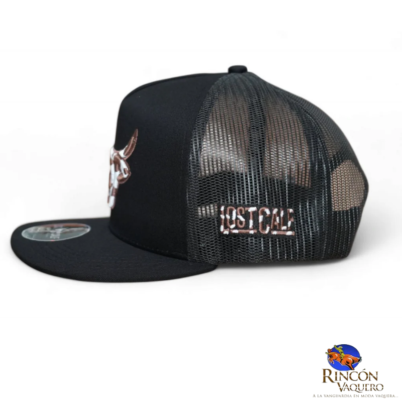 Gorra Lost Calf Cowhide Black con el logo de Lost Calf bordado en la parte delantera con estampado de toro y puntadas rojas. El logo de Lost Calf está bordado en el lado izquierdo. Cierre trasero a presión