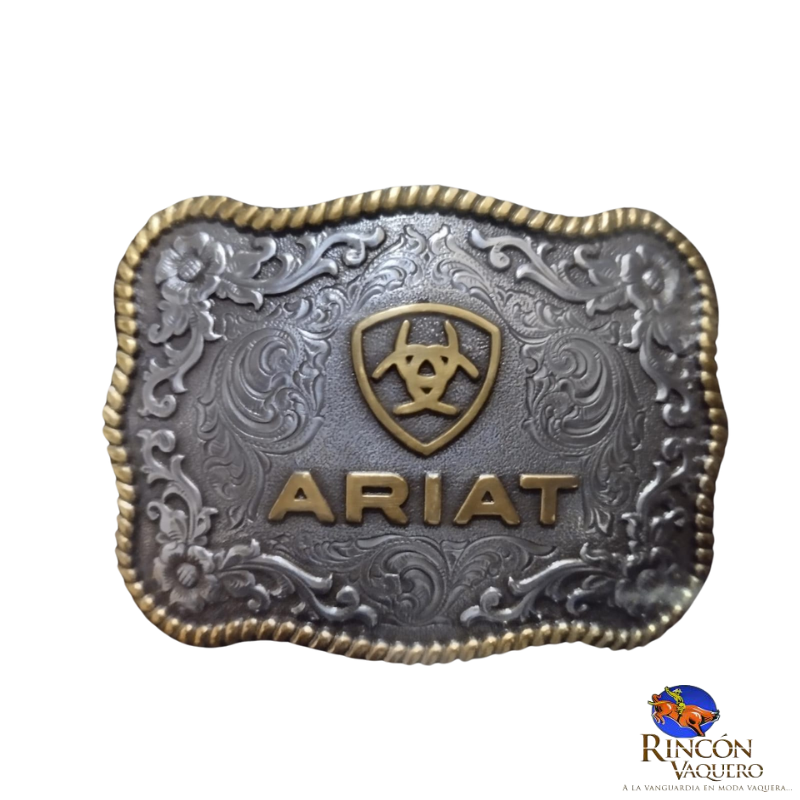 Esta gran hebilla festoneada de M&F Western Products luce el logotipo de Ariat. El fondo está decorado con flores y volutas, con una filigrana añadida que le da profundidad. Está acentuada con un ribete de cuerda retorcida.