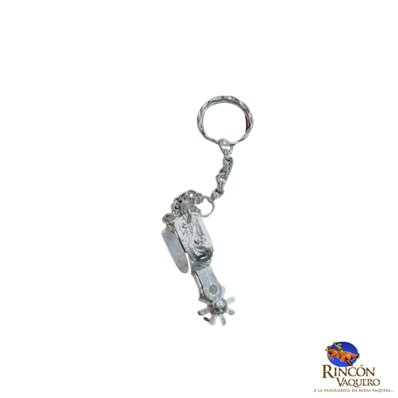 Inspirado en el mundo del rodeo, este llavero presenta un diseño de espuelas en miniatura que evoca tradición y carácter vaquero. Fabricado con acabados metálicos resistentes, es un accesorio distintivo que rinde homenaje al espíritu del campo y la vida a caballo. Ideal para quienes buscan un detalle auténtico con fuerte identidad western.