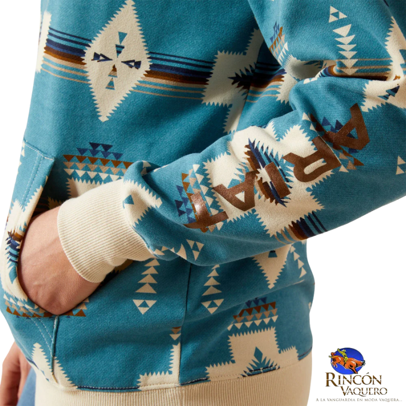 - Añade un toque de encanto del suroeste a tu look con la sudadera con capucha color verde azulado de Ariat para mujer, que presenta un vibrante estampado azteca y el icónico logotipo 2.0: ¡perfecta para días acogedores con un toque de estilo.